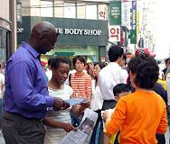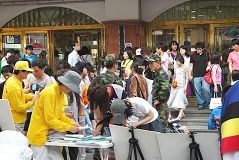 ![]() 人们认真的观看法轮功真相展板 | ![]() 路人详细询问法轮功真相 |