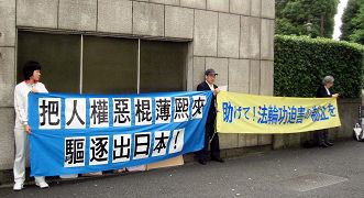 法轮功学员散发的日本法轮大法学会致日本国会议员的请愿信中说,我们要求禁止以酷刑罪和群体灭绝罪而受到国际社会起诉的中国商务部长薄熙来进入日本。