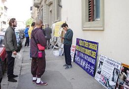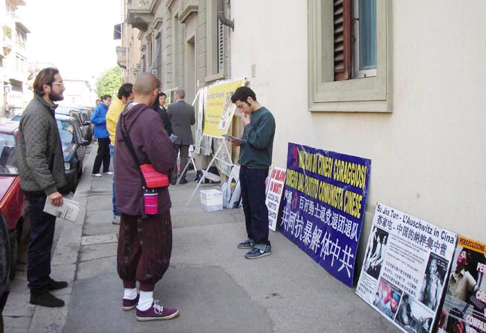 在佛罗伦萨中领馆抗议时,居住在对面的一位老者主动提出让学员把横幅和展板挂在他家的窗户上。当学员对他表示谢意时,老者一句一顿的说,“太感动了,太感动了,我不知道是什么力量让你们能做到你们正在做的。我太感动了,我太感动了。谢谢你们。”执勤的警官们在听了真相后,都对中共的兽行表示了愤怒,在活动结束告别时,有一位警官真诚的告诉学员,“请你们一定坚持,你们做的太好了”。在佛罗伦萨市中心的共和国广场(Piazza Repubblica)上,人们主动的静静观看真相说明,然后主动在反迫害的征签信上签名。