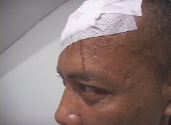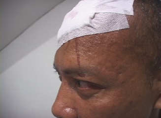 ![]() 凶手用手上的长棍子击打法轮功学员头部至出血 |