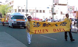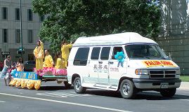 与以往游行不同的是,这次学员们把揭露“中共活体摘除法轮功学员人体器官”的真相资料夹在了介绍大法的传单里。学员们还准备了很多精美的纸叠莲花送给观众,非常受欢迎。这支与众不同的花车吸引了人们的注意,也得到了很多掌声和称赞。