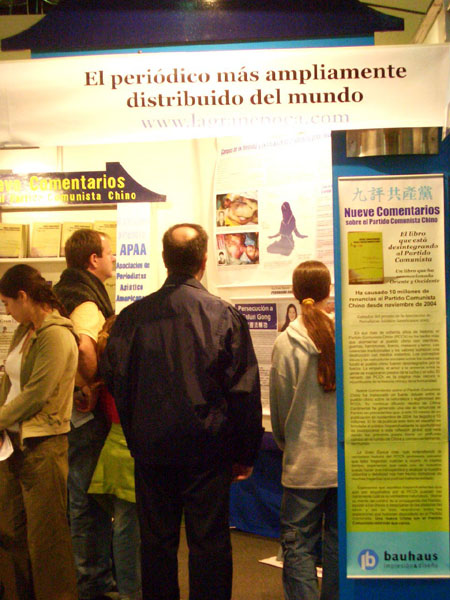 大.纪.元;摊位不仅展出西文的《·九·评*共产党》,并且提供大.纪.元;领先报导中共退!党!大潮的最新资讯以及关于中共劳教所活体摘取法轮功学员器官贩卖的情况,以便广传这被中共封锁的暴行真相。在这两个礼拜以来,摊位吸引了很多人, 仔细的阅读真相资料。一般阿根廷人都有对神的信仰,因此对中共活体摘取器官的行为纷纷表示这已经是魔鬼的行为了。