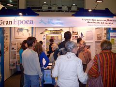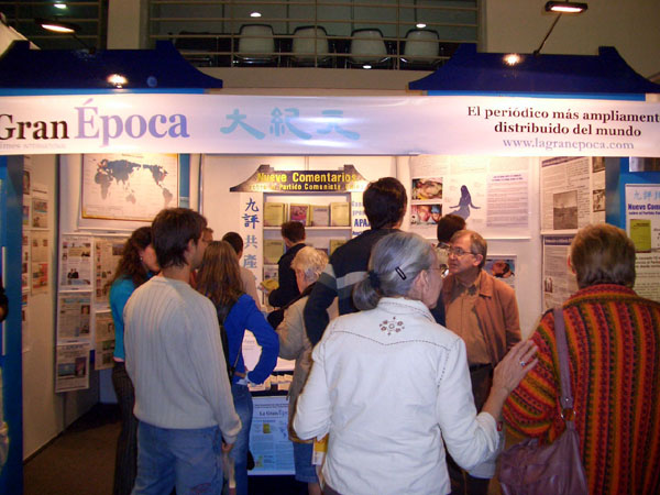 可是两年前由于中共大使馆企图赶走第一次参加书展的法轮功学员,并且威胁大会如不撤销法轮功摊位,它就退出。因为此无理的要求没有被大会接受,中共大使馆只有取消安排的文化研讨会,并且退出了大会。一个大会人员向大.纪.元;透露,两年来中使馆每年施加压力,要大会禁止法轮功参展,并且说有法轮功,中国使馆就不参加。大会只有说,那中共使馆就不要参加好了,因为这是阿根廷,任何参加的摊位只要没有暴力的行动,是有言论自由的,而且大会的宗旨是拥护人权的。该大会人员继续祝贺大.纪.元;的工作人员,说大.纪.元;报纸做的太好了。