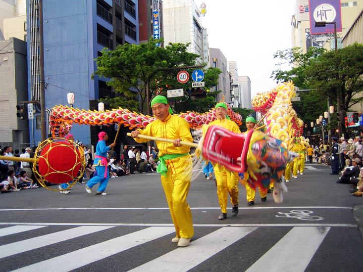 下午5时左右,游行开始。法轮功学员的游行队伍受到了人们的热烈欢迎,两边的路人频频鼓掌,向学员们挥手致意。队伍的最前面是“法轮大法好”巨型横幅;紧跟着是具有中华民族传统文化色彩的舞龙和舞狮,学员们精彩的表演博得了观众们阵阵的掌声和喝彩声。随后是身着黄色炼功服的炼功队伍,最后是古装的仙女队和唐装队,她们翩翩起舞,宛若下凡的仙女,许多观众用相机拍下了这精彩的瞬间作为纪念。