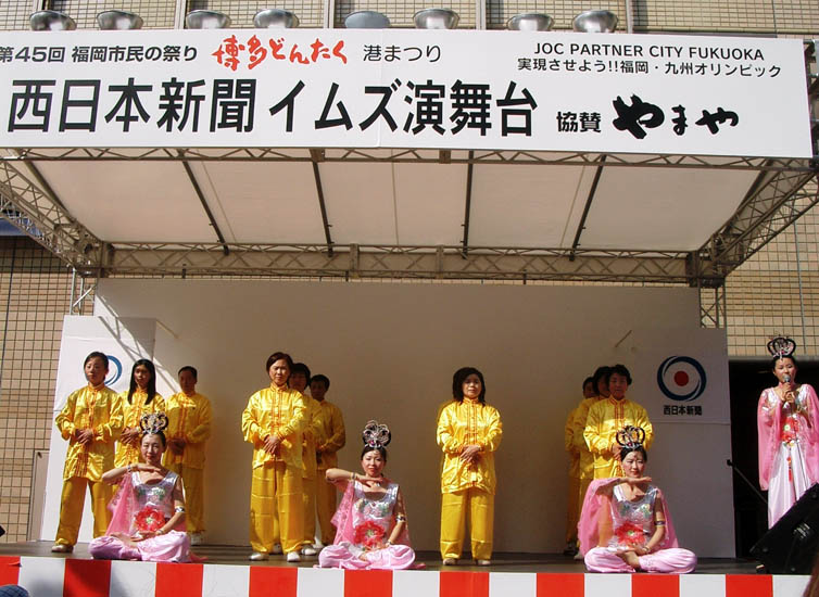 学员们不仅参加了游行,还参加了舞台表演。首先是四位仙女表演舞蹈,然后是功法演示,人们看到这么柔美祥和的炼功动作纷纷跟着学起来。由于表演受到了观众的热烈欢迎,法轮功学员被邀请在舞台上再度演出,由于是露天舞台,不仅使现场观众,而且使路人也能驻足观看表演,了解法轮大法的美好。