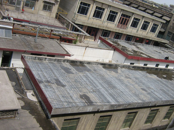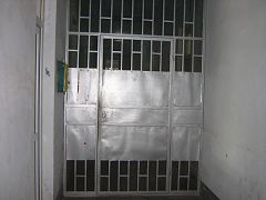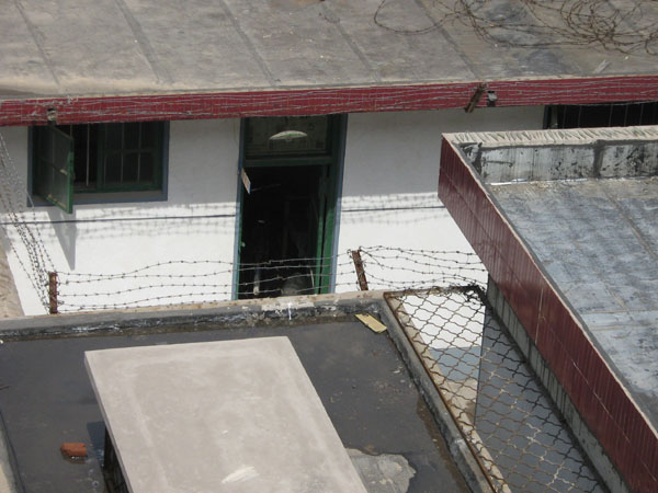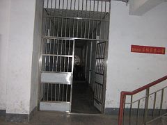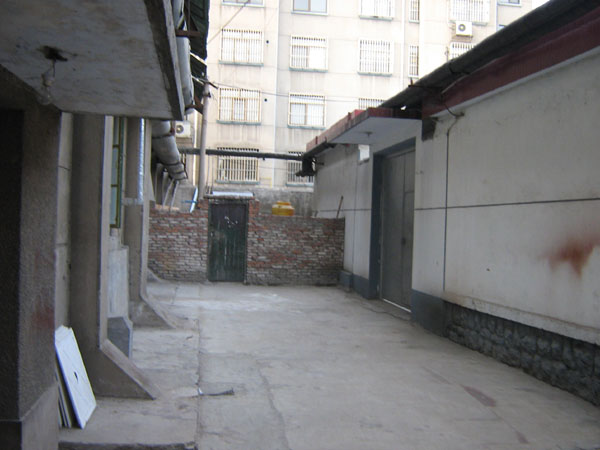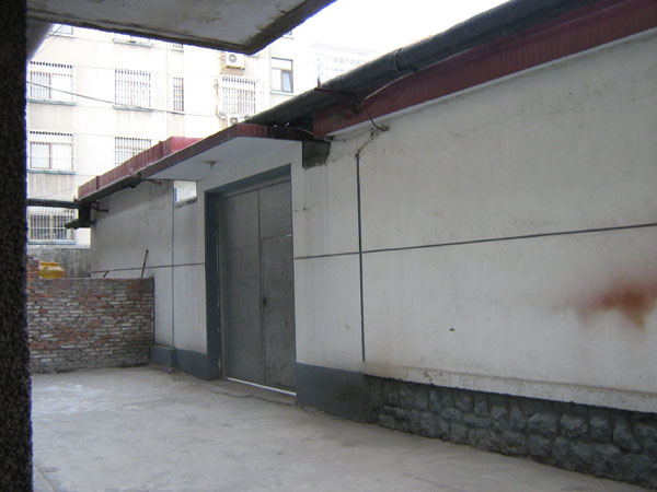 3、穿过楼道,是办公室与非法关押大法弟子的两排平房相连的地方(左图)。这是关押迫害大法弟子的两排平房的大铁门(右图) 。