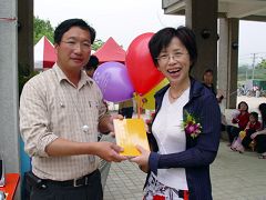 主办单位金门县社会局代理局长黄雅芬,欢喜的接过学员赠送的《转法轮》一书。她对于法轮功学员为金门广大乡亲热忱付出的心很是感动,表示是自己要学习的,并允诺办理法轮功相关讲座,净化乡亲的心灵。