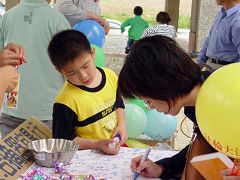 拿着气球的孩子,开心的随着学员们高呼“法轮大法好”,一时印有“法轮大法好”、“世界需要真善忍”字样的气球飘扬在会场的各个角落。