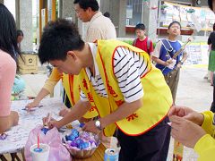 会场的一隅,孩子们纷至沓来,耐心的学着莲花的摺法,亲手摺的纸莲花不仅可以献给妈妈,更把“法轮大法好”的祝福也一并带进了家门。中午过后,金门的大街小巷又添了许多悬挂有“法轮大法好”字样的莲花吊饰。