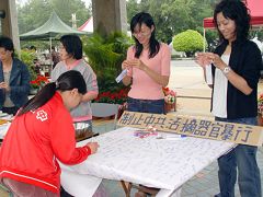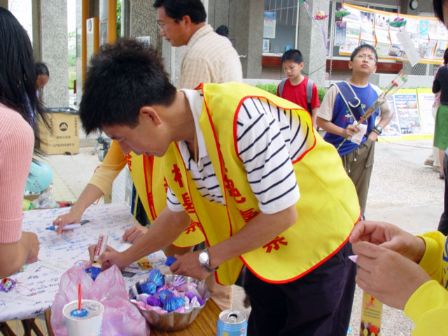 六月是金门村里长的选举,今天的园游会地方法院检察署也到场宣导反贿选。身着反贿选背心的义工们,也携手到摊位前签名,支持法轮功学员反迫害。