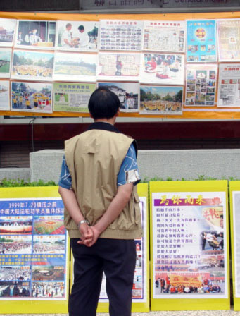 一张一张的图片,述说着法轮大法的洪传与在中国正遭受的惨绝人寰的迫害。摆放于会场周围的真相展示,吸引有缘人驻足观看。