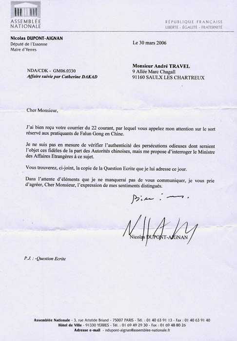 【明慧网2006年5月7日】最近,法轮功学员写信给法国埃松省(Esson)选区国会议员、耶亥斯市(Yerres)市长尼古拉•杜蓬-艾尼昂先生,揭露中共对法轮功学员的野蛮迫害与屠杀。就此,杜蓬-艾尼昂书面提问法国外交部长,要求法国对中国当局采取措施制止这些罪行。