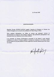 尼古拉•杜蓬-艾尼昂先生请求外交部长先生注意法轮功修炼者们在中国的境况。