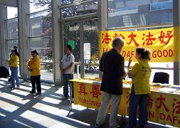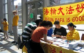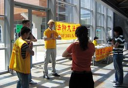 ![]() 认真学功的女大学生 | ![]() 法轮功学员在大厅设置展位并进行功法演示 |