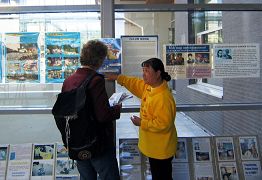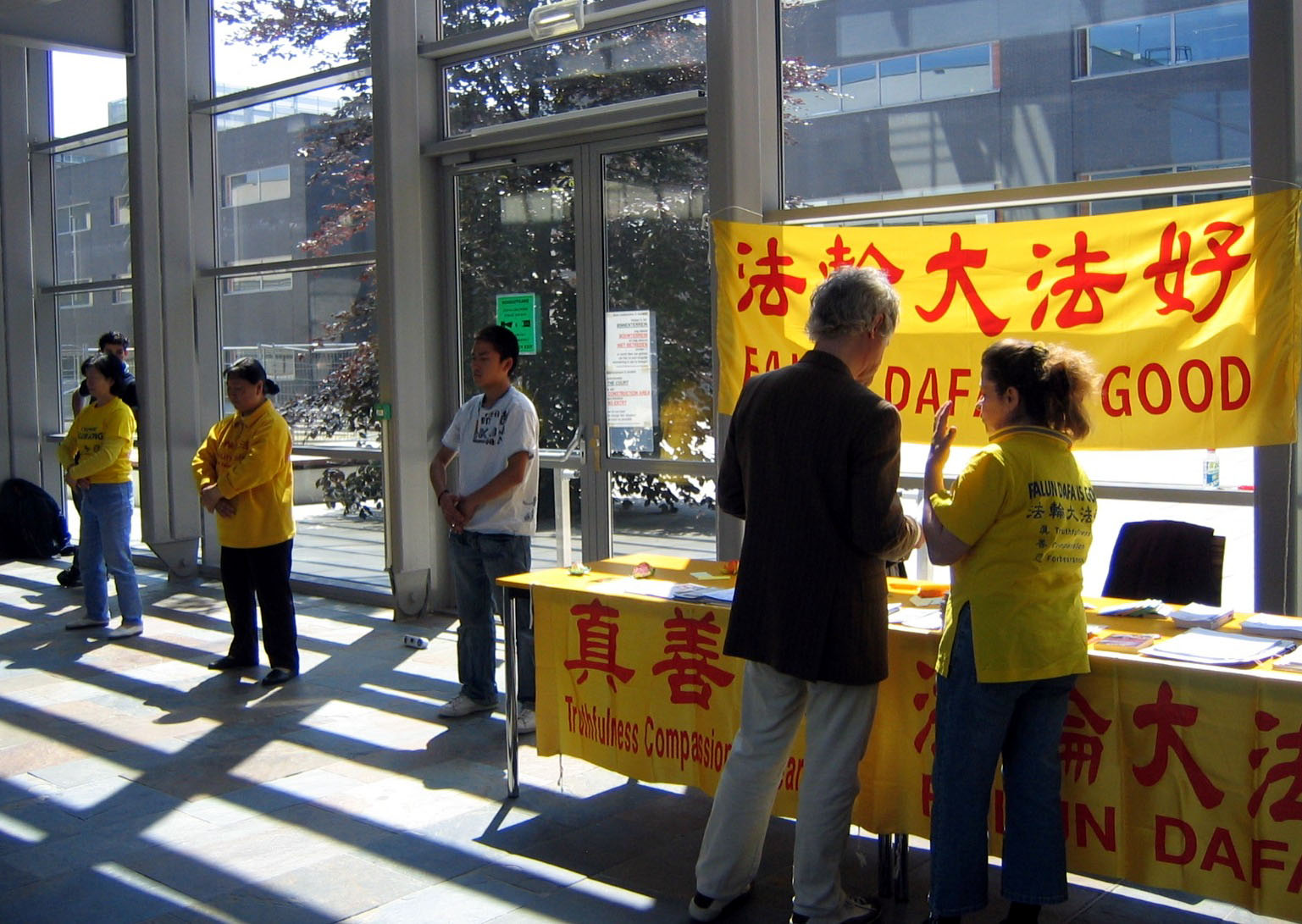 大厅中,学员们优美的炼功动作、美妙的音乐、醒目的黄色横幅及图片展吸引了许多来往学生和老师们的目光,他们主动到展位询问更多信息。