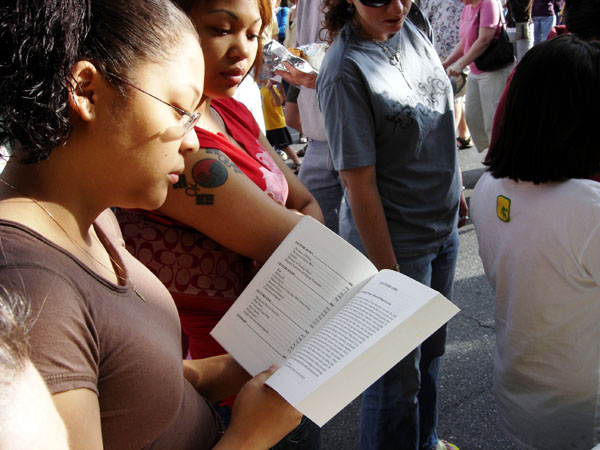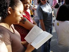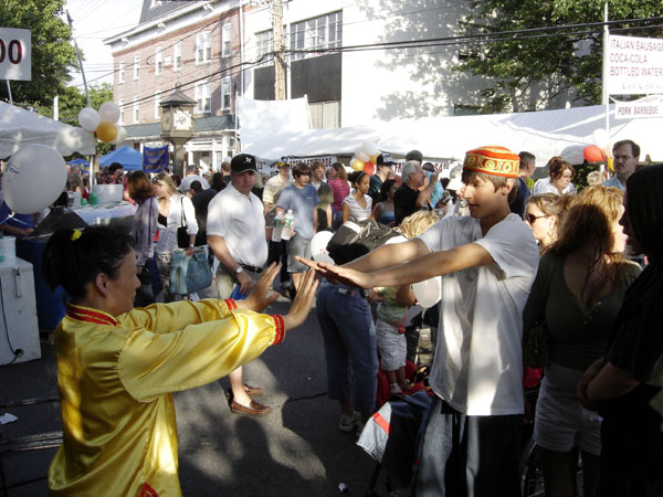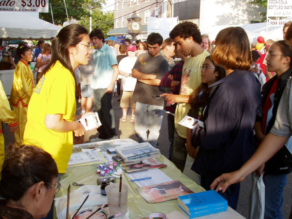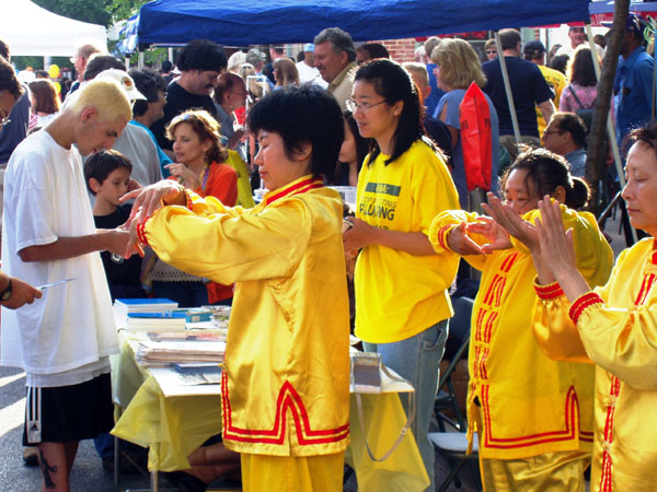 在川流不息的人群中, 法轮功学员们静静的展示平和的五套功法,深深吸引了人们的注意力,在热闹的夜市中构成了一道独特的风景线,人们纷纷停下脚步,索取法轮功的资料、学炼法轮功,并在呼吁制止中共迫害法轮功的请愿信上签名,呼吁美国国会和布什总统敦促中国政府开放所有的劳教所、监狱及相关设施,无条件接受“赴中国大陆全面调查法轮功受迫害真相委员会”的调查取证。