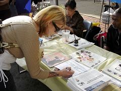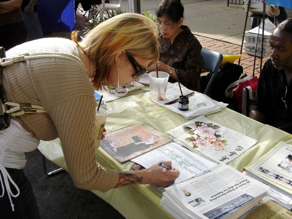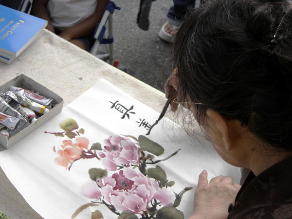 在法轮功的展位前,许多人围看一位六十多岁的老妈妈画中国画,这是一位刚从山东来的法轮功学员,擅长丹青,老妈妈为有缘之士画画,并在每幅画上写“真善忍”“法轮大法好”。 法轮功学员向人们讲述真相:迫害法轮功的首恶江泽民前些日子去山东,要参观济南百脉泉公园里的龙泉寺,当地官员知道江泽民最害怕法轮功,竟涂抹掉了刻在西墙上的“精,气,神,真,善,忍”六个大字。对“真善忍”的仇恨,是江泽民利用中共迫害法轮功的根本原因。 这位山东老妈妈,用中华的传统艺术手法做画,把法轮功的“真善忍”带给善良的人们。