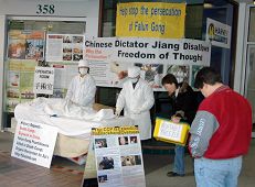 【明慧网2006年6月12日】2006年6月9-10日,新西兰法轮功学员于首都惠灵顿举行两天活动,以真人模拟演示的方式,揭露和抗议中共活体摘取法轮功学员器官的残暴罪行。学员们和支持者还在惠灵顿市中心举行了抗议游行,同时声援1100万勇士退出中共。 活动受到当地民众的关注,很多人都谴责中共的暴行。