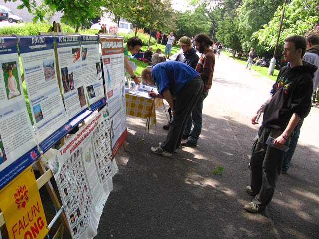 捷克法轮功学员觉的参加这场活动,让民众知道法轮功在中国所遭受的迫害很重要。他们设置了展位,告诉人们中共对法轮功学员進行残酷迫害所犯下的严重罪行。民众也了解到被非法关押的法轮功学员遭中共活体摘取器官的惊人黑幕。参加抗议节的民众纷纷签署请愿书,请求捷克总统及总理帮助制止中共的这种残酷暴行。