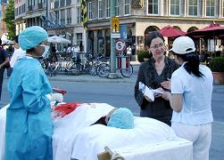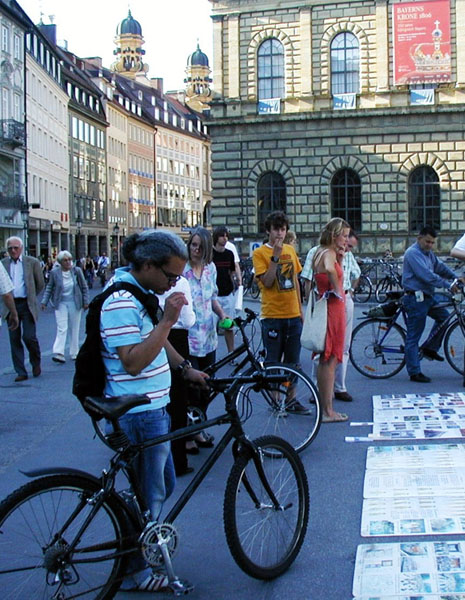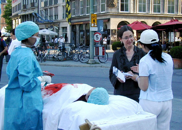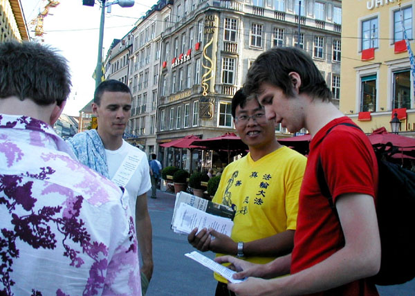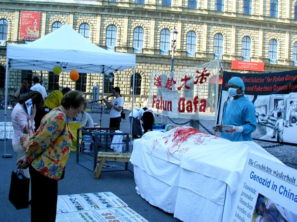 2006年6月14日,在世界杯足球赛期间,继开幕式之后,慕尼黑再次成为赛场,来自世界各地的球迷和游客聚集在此。法轮功学员抓紧时机,通过炼功、展板及真人模拟表演等方式,向当地居民和来自世界各地的游客展示法轮功的美好、洪传世界的盛况,并揭露中共劳教所、集中营、医院迫害法轮功学员,对学员实施酷刑、甚至活体器官摘取的罪行。