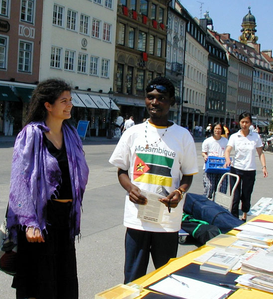 ![]() 签名声援法轮功的莫桑比克球迷 | ![]() 来自瑞典的球迷听学员讲真相 |