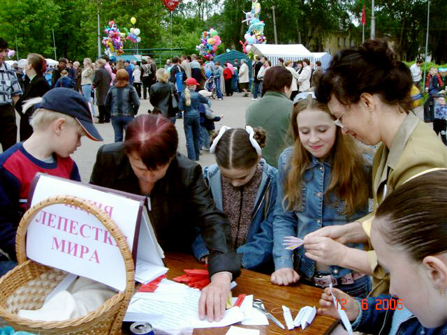 6月12日,学员还举办了纸莲花“世界花瓣”活动。这一天正逢俄罗斯节、城市节和镇节。天气晴朗,阳光明媚,镇上聚集了许多的人,甚至附近城市和地区也来了不少人参加节日的活动。
