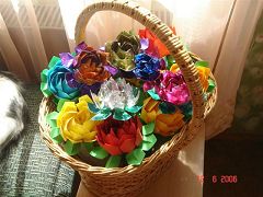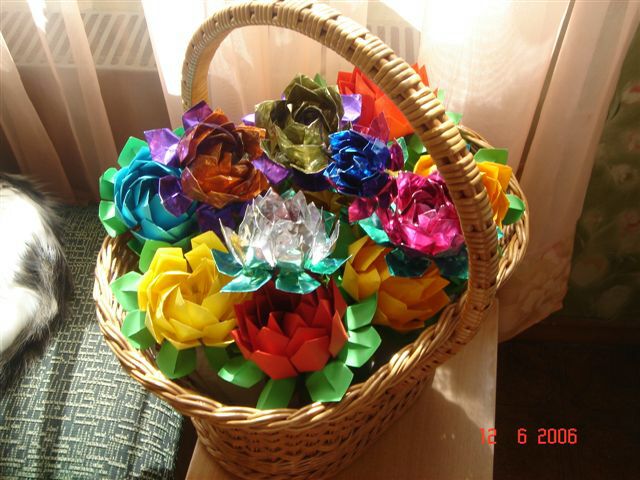 ![]() 展位前学做纸莲花的孩子们 | ![]() 纸莲花花篮 |