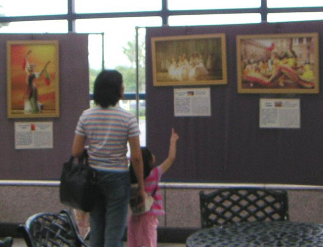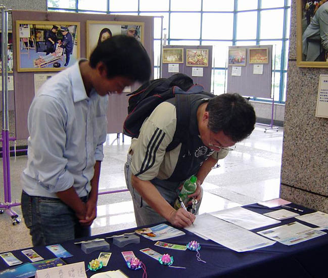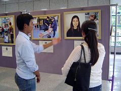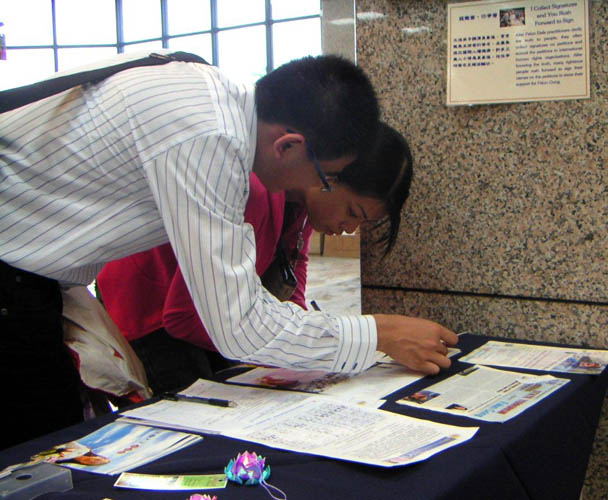 一位来自香港的同学在看完了摄影展内容及导览介绍后,被深深的震惊了,不仅在“营救法轮功学员遗孤”的征集签名簿上签名,也索取许多莲花书签,说要送给周遭的同学们。另一位同学表示,第一次看到那么多国家的人都在炼法轮功,这些图片真的很珍贵。