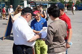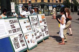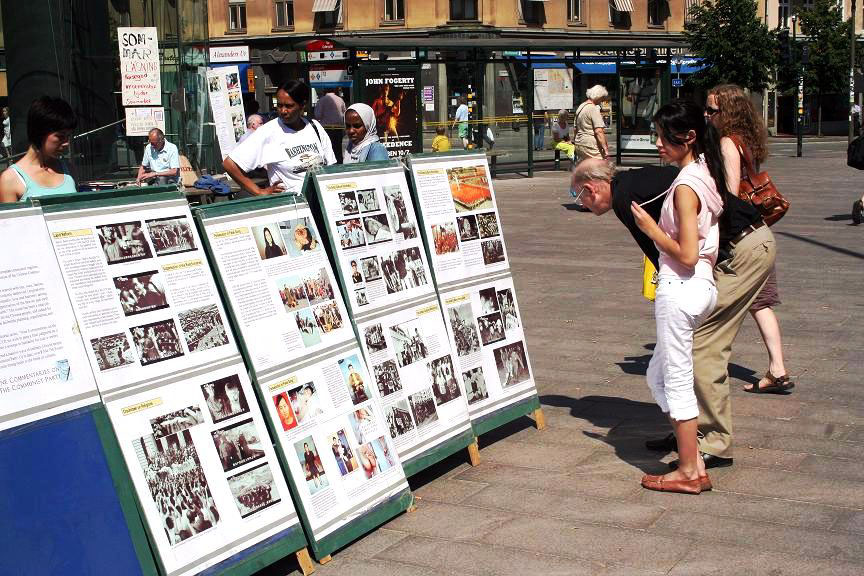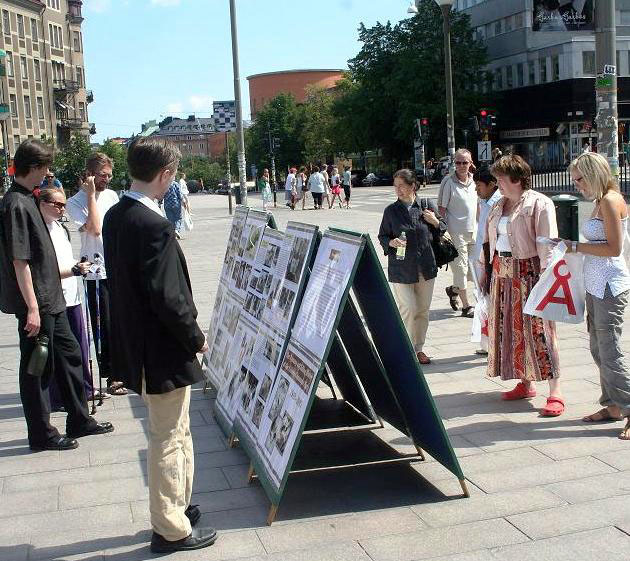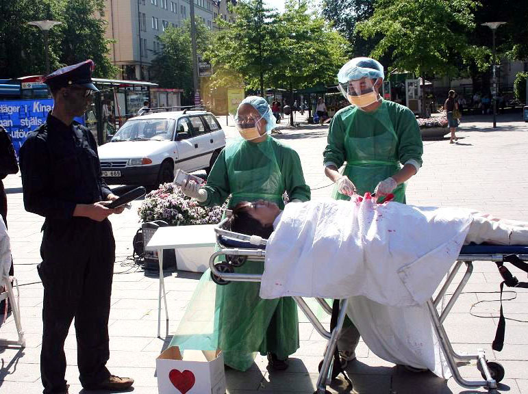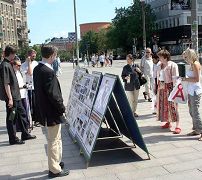 【明慧网2006年6月19日】法轮功学员和瑞典退!党!服务中心于2006年6月17日在斯德哥尔摩市中心的吾登普朗(Odenplan)声援1100万勇士退出中共,并以真人模拟的方式向民众揭露中共活摘法轮功学员器官的滔天罪行。
