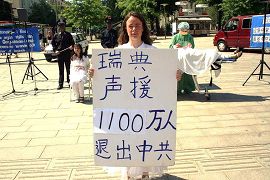 瑞典退!党!服务中心的卡特琳娜(Katerine)举着 “声援1100万人退出中共”