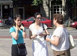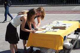 真相展板、搭起手术台揭露中共活摘器官交易的血腥一幕,配合现场解说,告诉经过的人们目前发生在中国劳教所和集中营中的暴行。现场活动人员并向过往民众派送揭露中共暴行的传单及退!党!传单,吁请民众签名声援退!党!和反迫害。天气极好,广场上有许多的行人都被广播和图片展板、活摘器官真人演示吸引,人们都停下来观看。