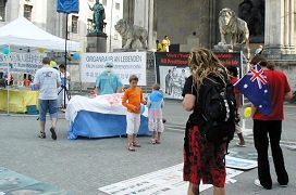 一位生活在伦敦的阿根廷球迷在慕尼黑欧地安斯广场看到有关中共迫害百姓、践踏人权的展板和真人模拟表演,立即签名反对中共的暴行。他告诉大.纪.元;义工,在伦敦时就已经了解到事情的真相了。