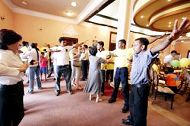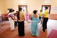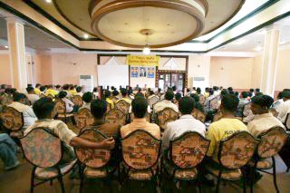 ![]() 印度学员手制莲花布置会场 | ![]() 叠罗汉式布置会场高处 |