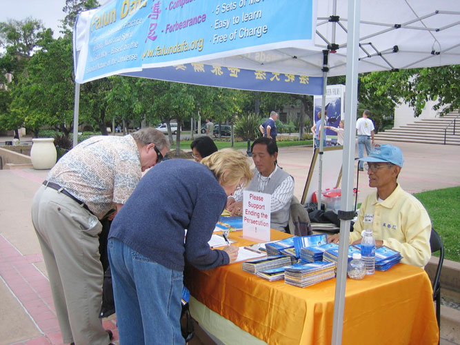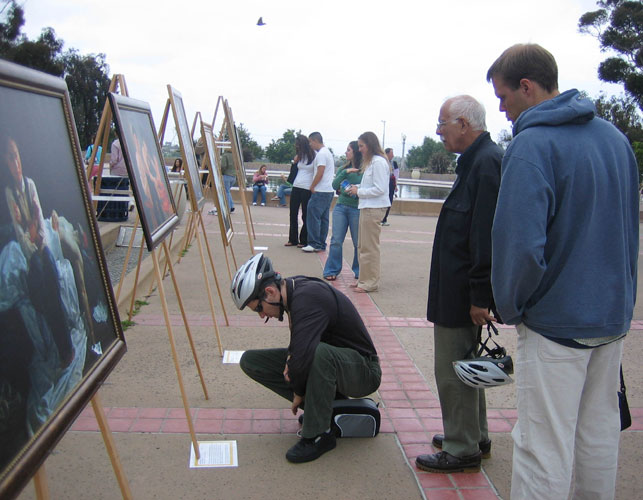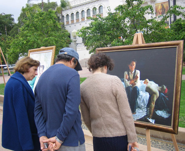 有人用照相机拍下作品和画展的场面,有人眼里噙着泪水,也有人哽咽着,有人看完画展后立即走向征签处,在签字簿上庄严的留下他们支持大法弟子反迫害的签名。当然了,也不断有人前来询问如何学炼法轮功。几乎所有的人都问着一个共同的问题,那就是:为什么会有这样的迫害?