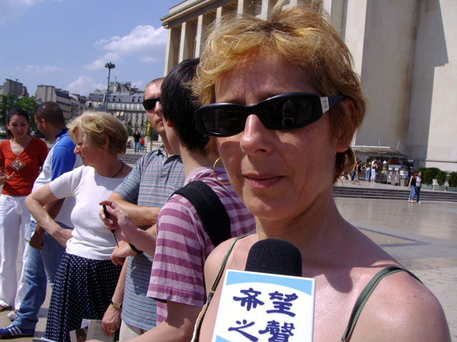 一位法国女士看到中共活体摘取法轮功学员器官的资料图片,她说:“这太让人震惊了。我们对在中国仍存在集中营这些事情一无所知。的确,对于法国的历史来说, 德国人的集中营给我们留下深深的刺痛,那些真的是太糟糕了,我们认为这样的集中营不会重新出现在现在这个年代,而在现代中国这还是出现了,真的是很让人吃惊。”