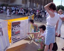一个女孩看到这些酷刑的图片后,她问法轮功学员是怎么回事,听完法轮功学员的解释后,她说:“它们(中共)这种做法,很不好!”