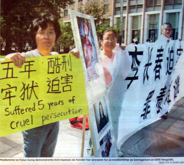 在挪威首相办公室外,法轮功学员正在进行抗议。挪威法轮功发言人彼得•耶弛森(Peder Giertsen)说:“我们的横幅提出了制止迫害法轮功的要求,同时告诫李长春迫害法轮功罪责难逃。”