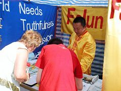 很多游客主动在敦促英首相和英政府支持调查、制止中共活体摘取法轮功学员人体器官的征签表上签下名字。有的游客在接了传单后边走边看,看明白后又折回来要求签名。有的游客签了名后,又去其它展位把家人找来签名。