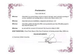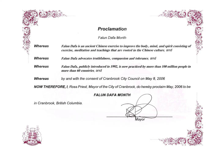 鉴此,我,罗斯•普莱斯特(Ross Priest),克兰布鲁克市市长,特此褒奖2005年5月为“法轮大法月”。