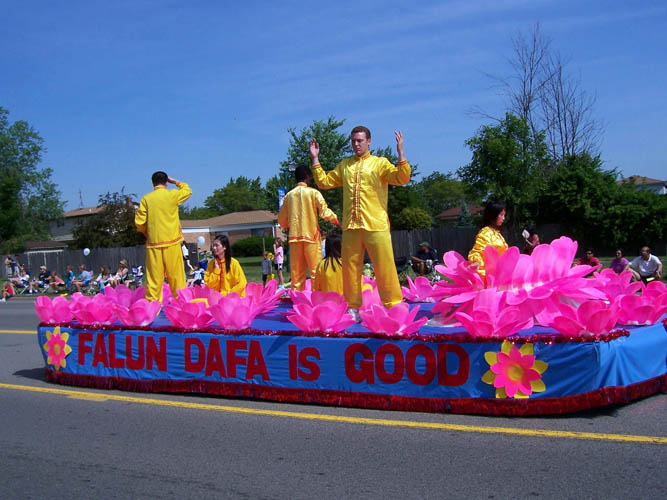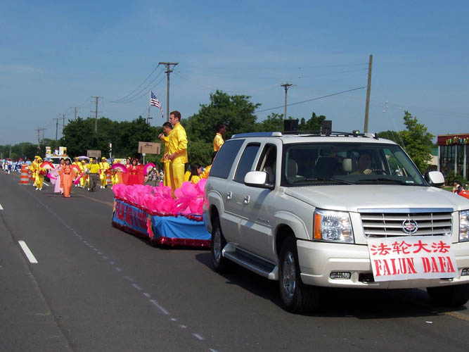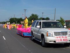 密西根州法轮功学员今年所装点的花车别有新意。一朵朵粉红的大莲花参差错落在花车上,身着炼功服的学员有的在炼功、有的端坐在莲花上,给人一种宁静祥和、富有神韵的美的享受。伴着“法轮大法好”的音乐,法轮功学员组成的仙女队和腰鼓队一前一后,使人耳目一新,观众有的鼓掌,有的竖起大拇指,有的微笑着挥手致意。观看游行的人群中也有不少华人,他们也高高的举起手微笑着向法轮功的游行队伍挥手致意,给予支持。