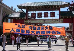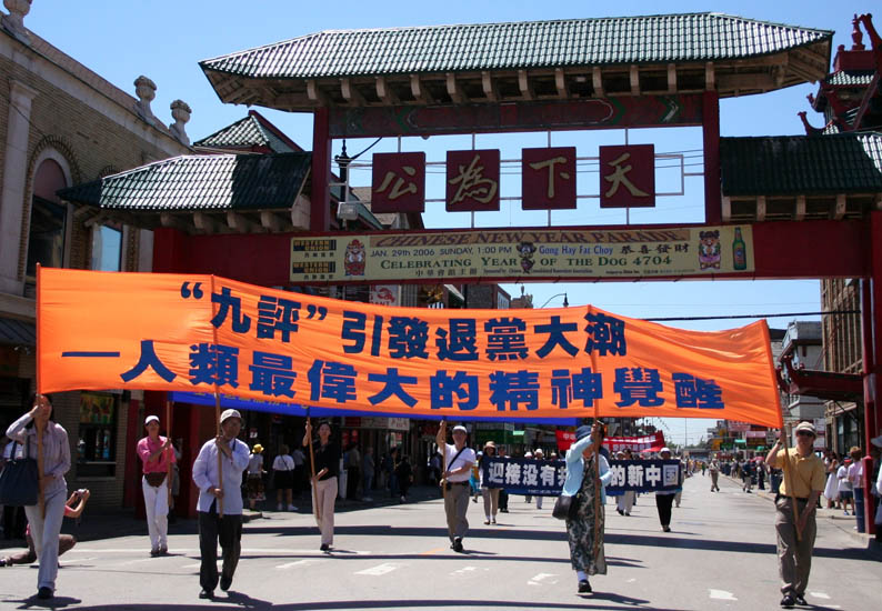 声援超过1千1百万中国民众三:退.(退!党!、团、队)声援超过1千1百万中国民众三:退.(退!党!、团、队)游行队伍有法轮功学员展示功法,并有各类横幅标语,其中有要求法办迫害法轮功的中共元凶江泽民、罗干等元凶,呼吁全面调查中共劳教所、监狱活摘法轮功学员器官的黑幕。举办活动的组织者表示:“·九·评*在中国大陆广泛传播,大量中国民众觉醒,每日都有大量中国民众透过互联网在大.纪.元;新闻网声明退!党!。”
