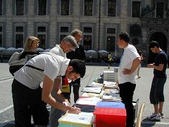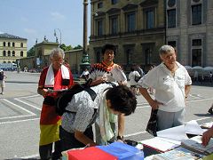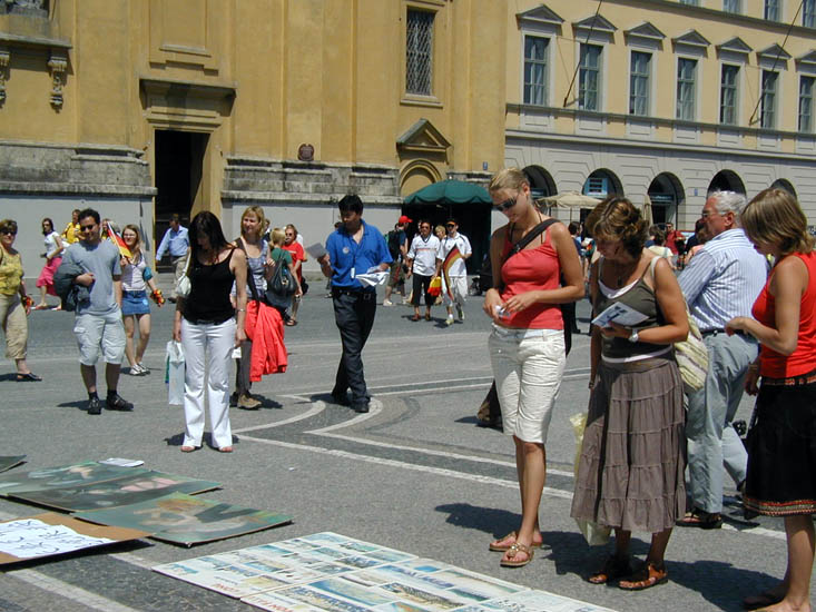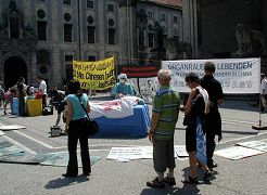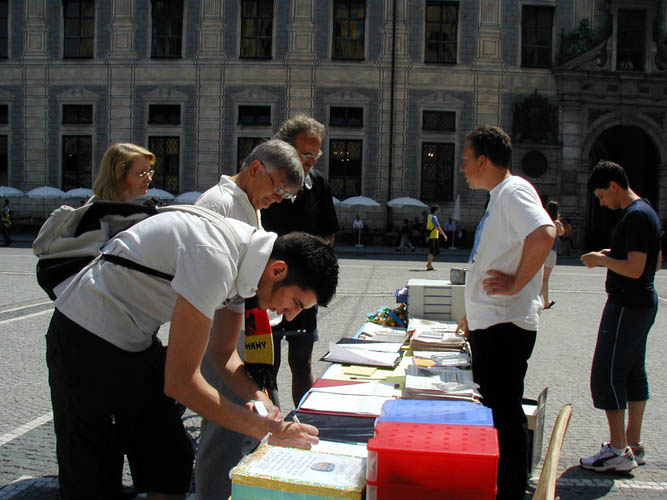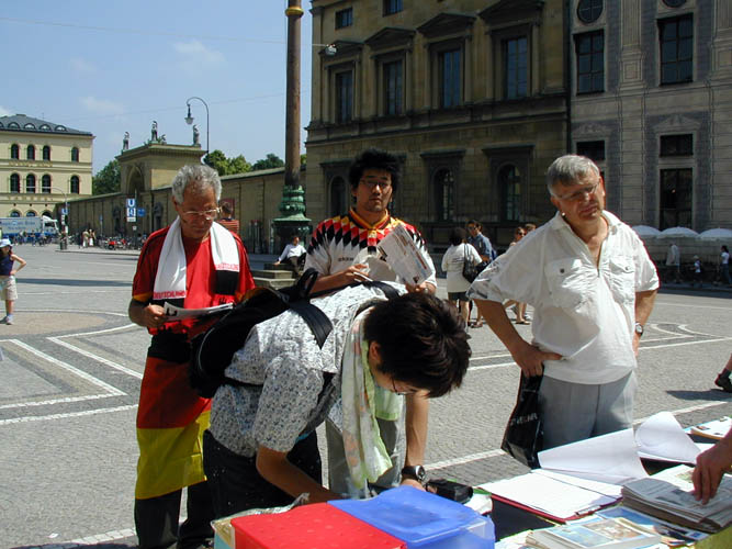 2006年6月24日,世界杯足球赛东道主队在慕尼黑(Munich)迎战瑞典队,赛前来自德国各地和全世界的球迷蜂拥而至,在慕尼黑市内的大街小巷浏览观光。借此机会,法轮功学员和大.纪.元;时报在欧地安斯广场(Odeonsplatz)共同举办了揭露迫害、声援退出中共的活动,在各界民众面前揭露中共暴政的真面目。