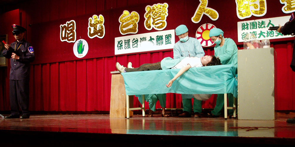 ![]() 图:行动剧表演法轮功学员被活剖摘取器官 |