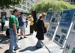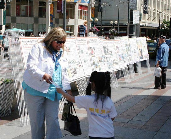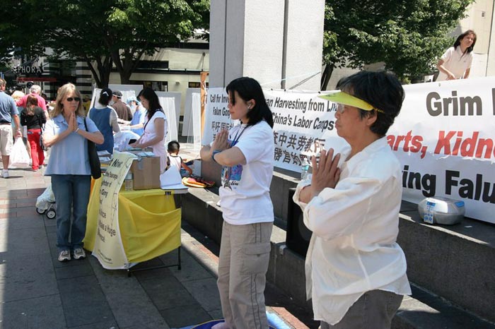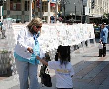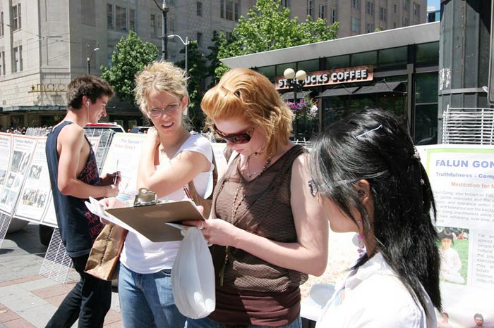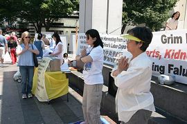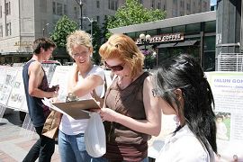 ![]() 签名呼吁制止中共对法轮功的迫害 | ![]() 一位路过的女士被祥和的法轮功功功法吸引 |