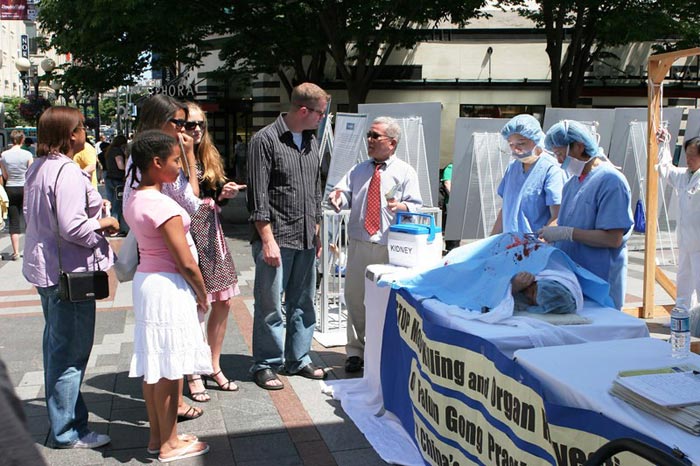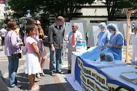 一位年轻的姑娘仔细看了酷刑演示和真相图片后说,非常震撼!用这种方式引起公众的关注这很好,任何人都无权这样残害别人。