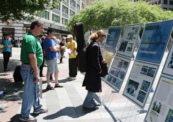 西湖广场人来人往,很多人看到真相展板和模拟的酷刑展很震惊,都想了解事情的真相。有人长时间注目着;有人找学员提问、要真相材料,急切的想知道究竟;也有人立即在呼吁制止中共迫害法轮功的信上签下姓名。