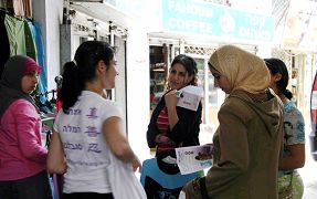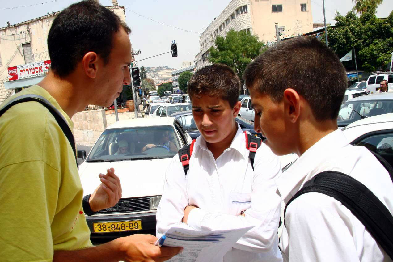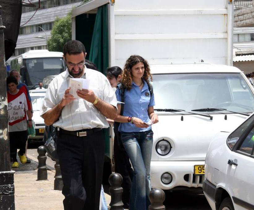 学员们带来了大量希伯来语、阿拉伯语、英语和其它语言的真相传单。大家分成几组,每个学员的手上都拿着各种语言的传单。有的学员向路人散发资料,有的征集签名,呼吁制止中共活体摘取法轮功学员器官。请愿书还专门为拿撒勒之行翻译成阿拉伯语。此行的目地是向这个古老历史名城的居民讲述法轮大法真相和展示大法的美好。由于学员中很少有人掌握阿拉伯语,给交流带来了一定的困难,但是大家最终还是能够相互理解,全城到处可见乘坐汽车阅读法轮大法真相传单的人们。