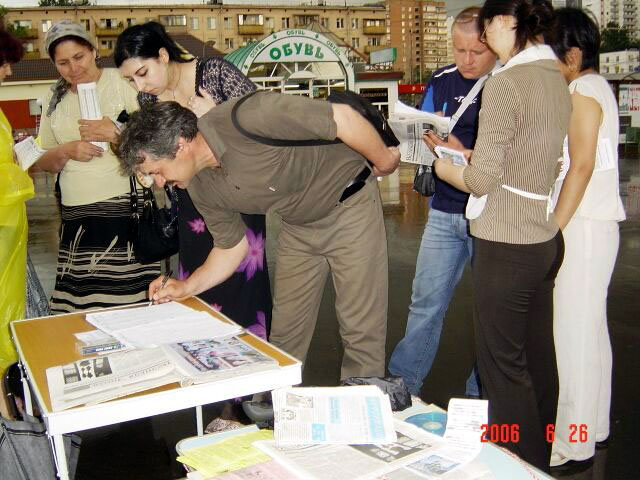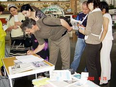 从这里过往的人几乎都被那醒目的大字横幅和活体摘取器官的模拟演示所震惊。人们不敢相信这是正在中国发生的对法轮功学员的残酷迫害。他们纷纷签名谴责中共,支持法轮功反迫害。