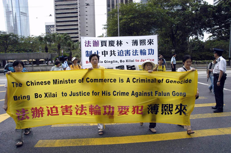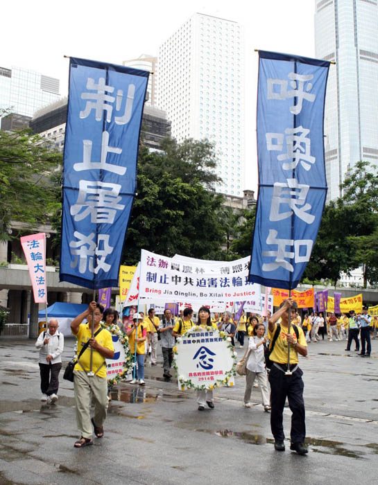 一百多名法轮功学员由中环遮打花园游行到香格里拉酒店外的示威区,进行和平静坐抗议。他们手持写有“法办贾庆林、薄熙来,制止中共迫害法轮功”、“彻查中共劳教所摘卖器官、酷刑、强奸、性虐待”等内容的横幅,呼吁制止迫害及法办参与迫害的要犯。法轮功学员在入夜后还举行烛光晚会,悼念被迫害致死的数千名大陆同修。