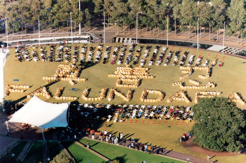 ![]() 法轮功学员在悉尼达令港排字、炼功 |